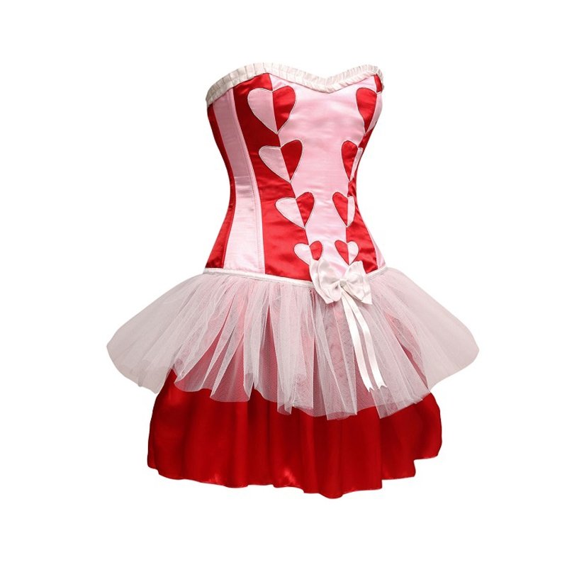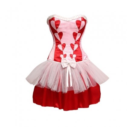 Note: Cupid theme corset dress. Soft romantic pink with red makes a cute combination. Heart shape applique embroidery on princess seam depicts the sign of love.
